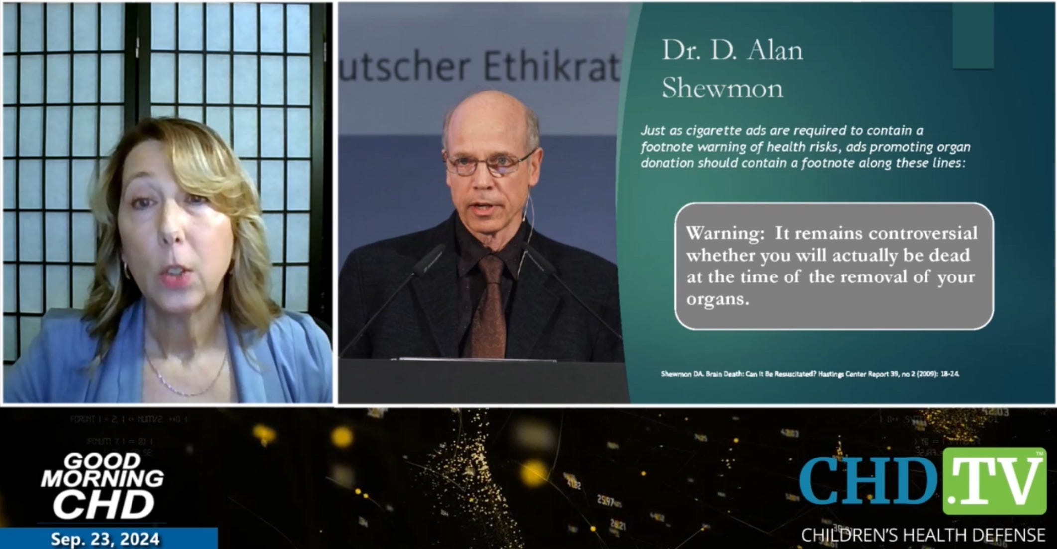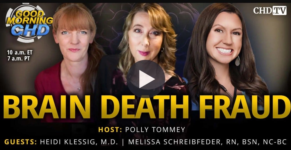 Children's Health Defense - Brain Death Fraud (and implications for organ transplantation). Polley Tommey interviews guests Nurse Angela and Alexis Lorenze, Heidi Klessig, MD, and Melissa Schreibfeder, RN, BSN, NC-BC (09/23/24, video 01:07:37, includes transcript)