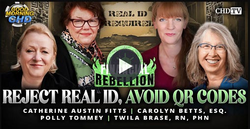 ⭐️ Financial Rebellion — Reject Real ID, Avoid QR Codes. Hosts: Catherine Austin Fitts, Polly Tommey, Carolyn Betts, Esq. Guest Twila Brase RN, PhN (10/24/24, video 01:01:18 includes transcript). Updated 11/05/24, 03/07/25, 03/25/25, 03/30/25, 04/25/25, 04/26/25, 05/04/25, 06/22/25, 06/27/25, 07/02/25