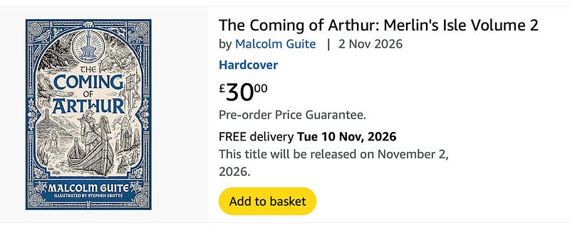 Oh look! I’ve not seen this officially announced yet, but a certain domineering online store has volume 2 of Merlin’s Isle, The Coming of Arthur, up for preorder for release in November – just in time for my birthday, by happy coincidence!