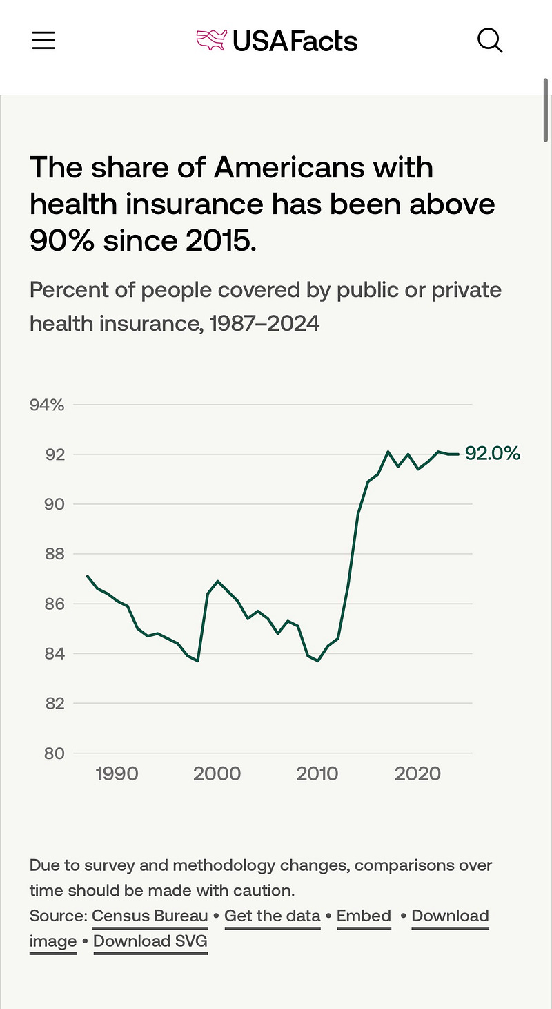 Over 20,000,000 more people got health insurance! The uninsured rate got cut almost in half—without causing a death spiral! People with preexisting conditions could finally get coverage they needed!