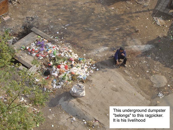 Do you think I would cheat him by not giving him glass bottles and aluminum cans? Isn’t that what Americans do in their homes? We become ragpickers in order to deprive ragpickers of opportunities.