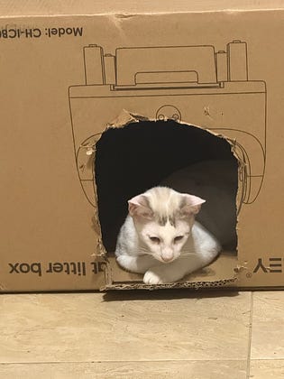 He is in my trap. He has a deep contralto cry. He isn’t happy. I don’t have a cage big enough for him to eat and use a litter box, so I have to find a vet who can house him until his surgery. I drove ½ hour through morning rush hour to sit outside a place which specializes in neutering feral animals. I hope this works. I haven’t thought of a plan B.