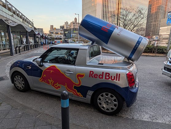 The Red Bull car visited my neighborhood yesterday.