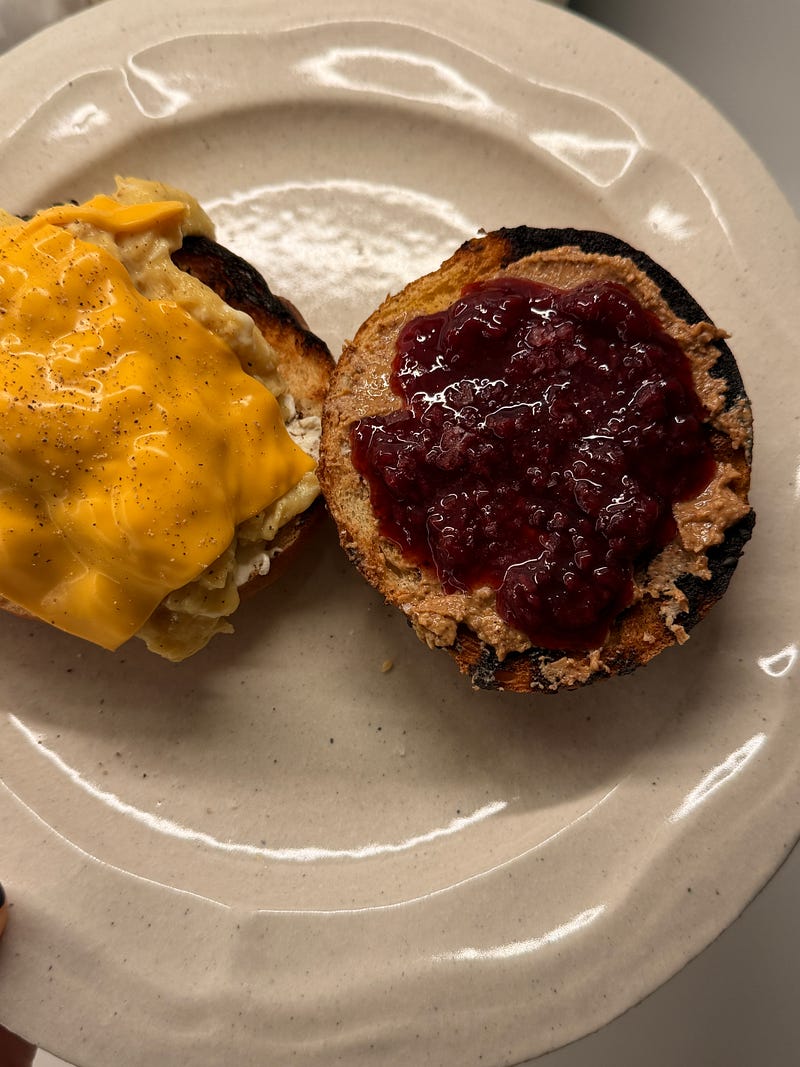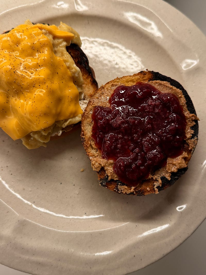Scramble eggs + american cheese and almond butter + mom’s rasp jam + flaky salt.