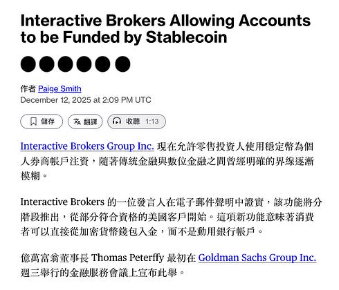 盈透證券(Interactive Brokers)開放穩定幣入金了,而且是 1:1 直接換成美元。目前先從最不需要這項功能的美國用戶開始測試。照慣例大概會跑幾個月,之後才輪到國際用戶