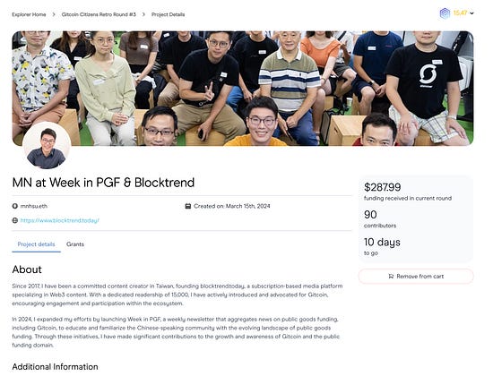 這次入選的 61 位個人,都是由 Gitcoin 篩選認定符合稱為 Gitcoin Citizen 也就是對 Gitcoin 發展有所貢獻的人。只不過這些人可以獲得多少回溯資助,得由全民說了算。我也有以個人名義參與,並獲得 Gitcoin 認可。