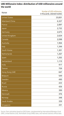 Distribution of millionaires (in USD) around the globe per UBS Global Wealth Report: “The United States hosts the largest number of USD millionaires in the world, by far. It counts almost 24 million of them, equivalent to 39.7% of the world’s total. That is over four times as many as the number two, mainland China, and more than the latter, France, the UK, Germany, Canada, Japan and Australia put together” (via TheIdeaFarm)