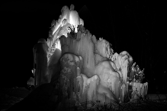 Water is the Aminus3 Photography prompt this week. This frozen water has formed in the cold of upstate ny, building gradually since December. This ice has been lit, so a night image was a must!