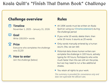 Second, I recommend you join Koala Quill and participate in its challenge (see screenshot). The app has many features that will keep you accountable, and you could even get paid $120 to write these 100,000 words!