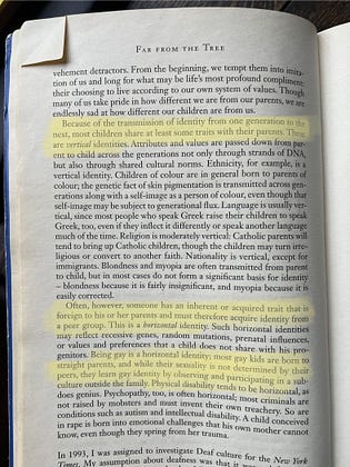 Very interested in Andrew Solomon’s concept of “vertical” vs. “horizontal” identity. Vertical identity is usually passed down by our parents (eg. ethnicity) while horizontal identity (eg. queer culture) is usually acquired from our peer group.