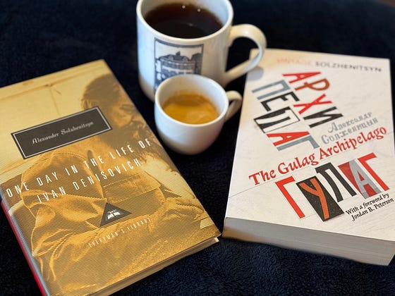 Double fisting ☕️ this fine Saturday morning and have reached the midpoint in Solzhenitsyn’s One Day in the Life of Ivan Denisovich. I must say that I prefer his nonfiction Gulag Archipelago to his fiction Denisovich.