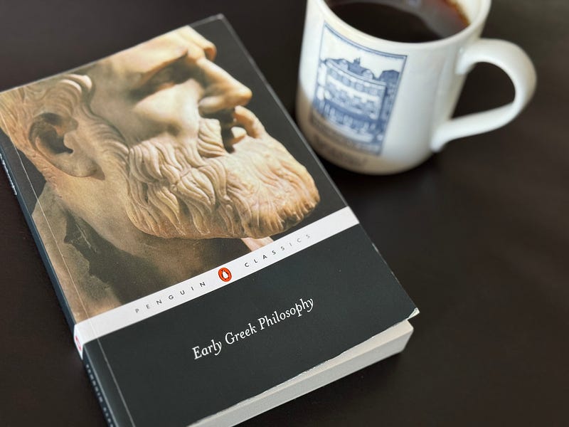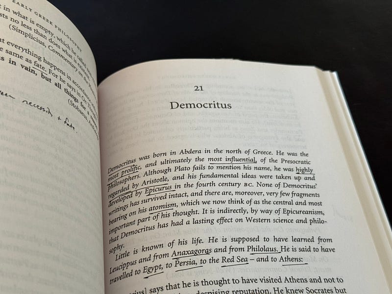 I finished Early Greek Philosophy this morning. This version is introduced and translated by Jonathan Barnes and was very good. Next up, I’ll be reading about the Sophists. One of the final philosophers covered in this book is Democritus. I really enjoyed learning about him and reading some of his surviving fragments and sayings. I’ll definitely do a podcast episode about him.