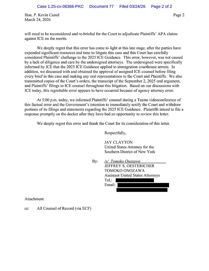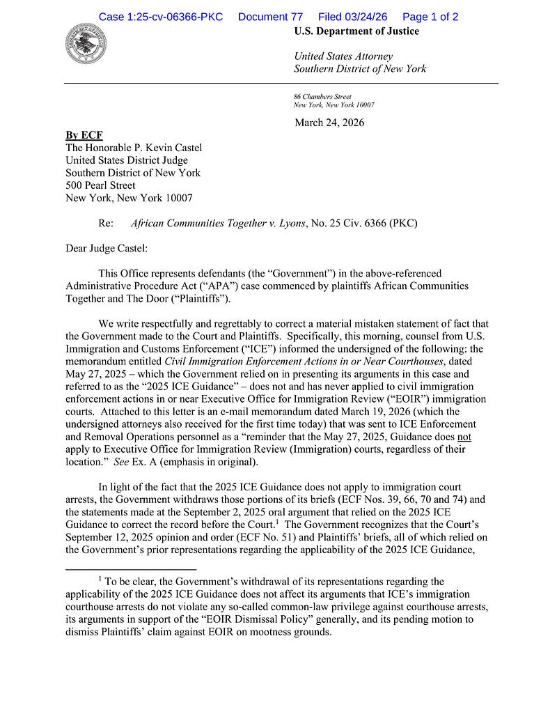 According to documents filed this morning by the U.S. Attorney for the Southern District of NY, ICE has been lying for a year — not only to the public, but to the courts and to prosecutors — about being authorized to make arrests at 26 Federal Plaza and other immigration courts.