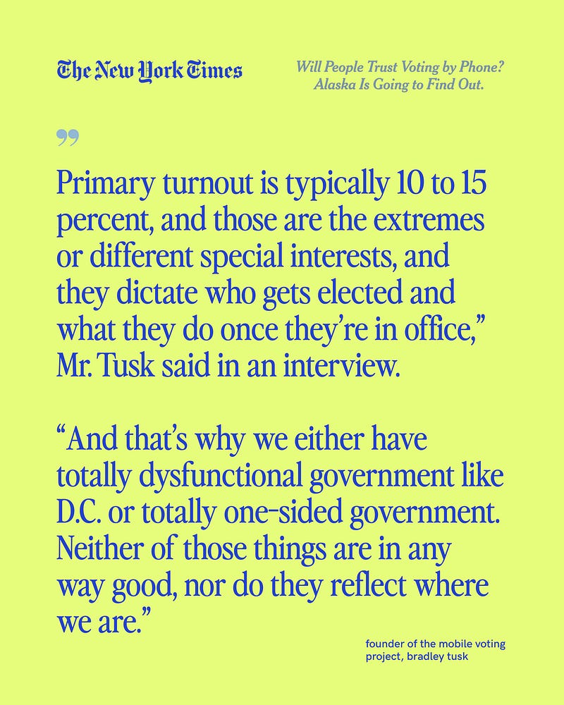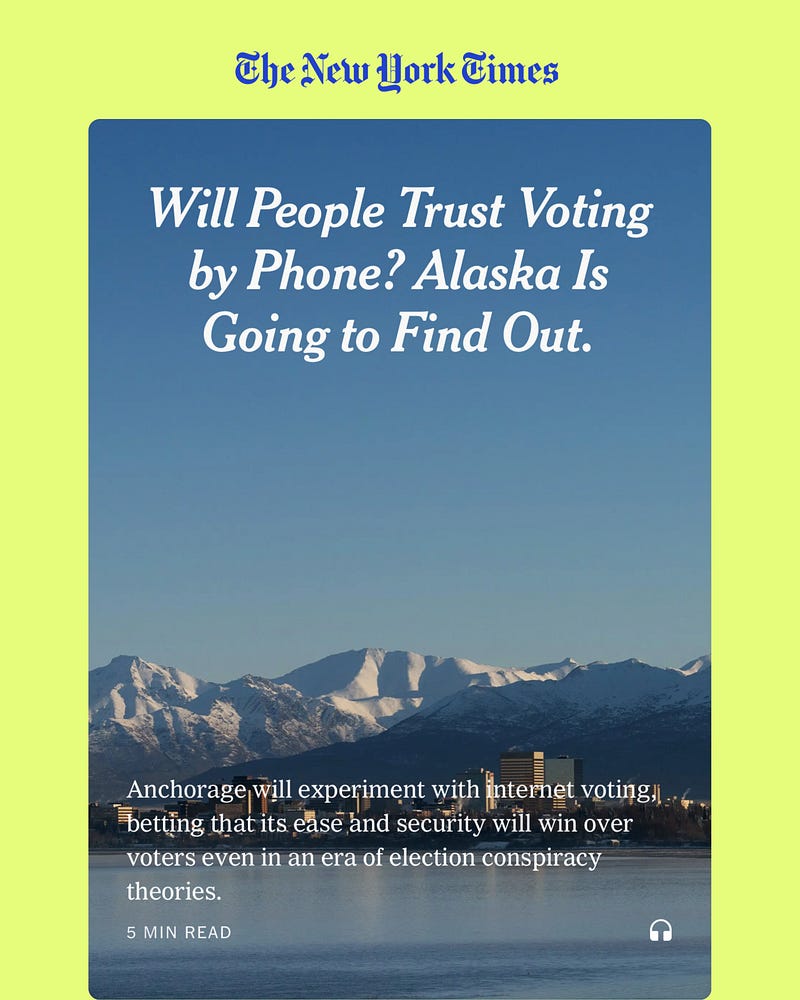 Anchorage, Alaska is moving forward in offering ALL: registered voters the option to vote from their phone in next April's local elections. This is a chance to showcase our new open-source technology that will make voting more secure and more accessible.