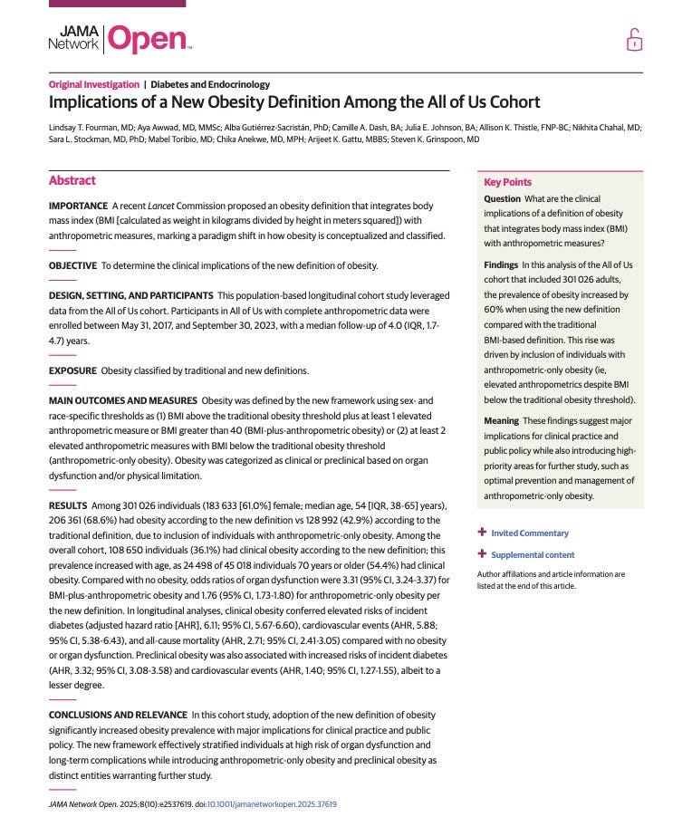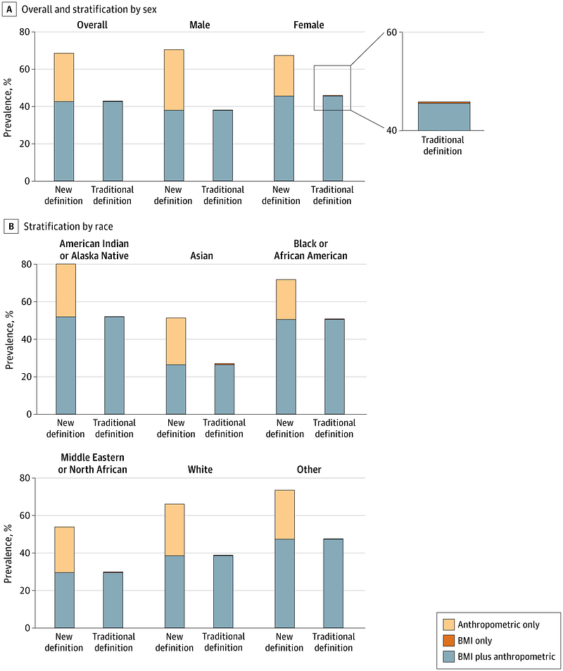 Using the old, BMI-only criteria, ~43% of Americans are considered obese. But with a new definition that combines BMI + elevated waist-to-hip and waist-to-height ratio (anthropometric obesity), 68.6% have obesity, with 80% of adults >70 years old categorized as obese.