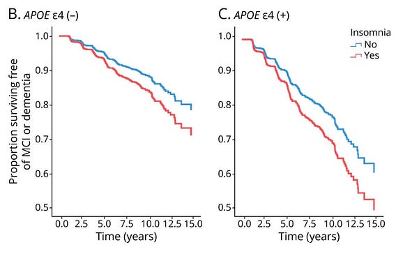 Those with insomnia + reduced sleep showed worse baseline cognition, more white matter changes, and higher amyloid burden