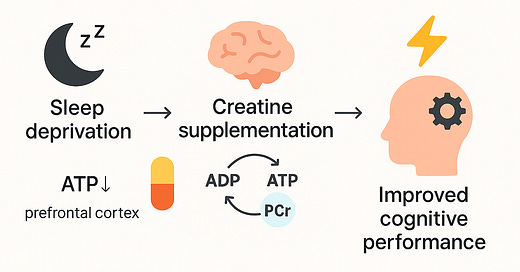 5-10g per day improves memory and processing speed under sleep deprivation and cognitive stress. Your brain uses creatine for energy the same way your muscles do.
