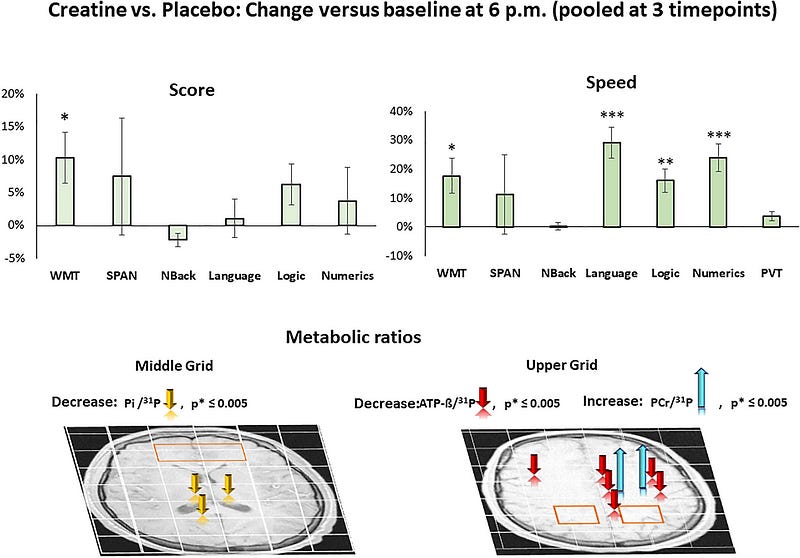 High-dose creatine (0.35 g/kg) partially reversed sleep deprivation-related cognitive and metabolic changes.