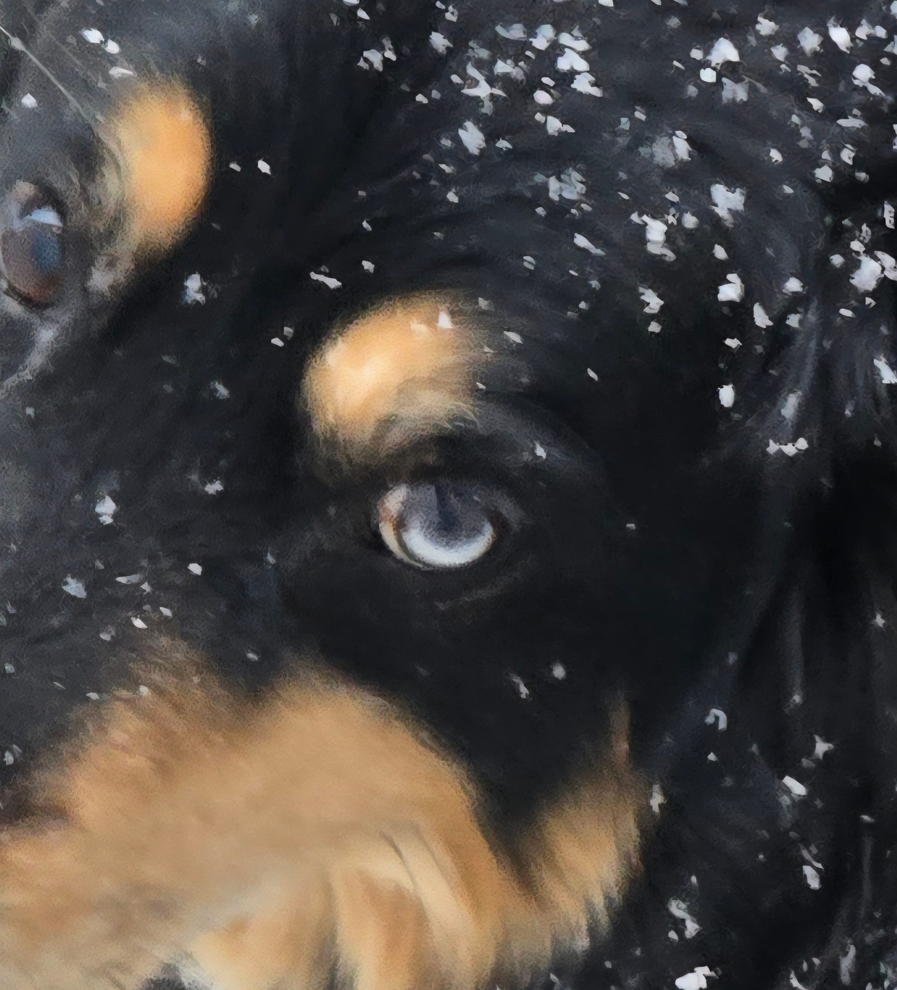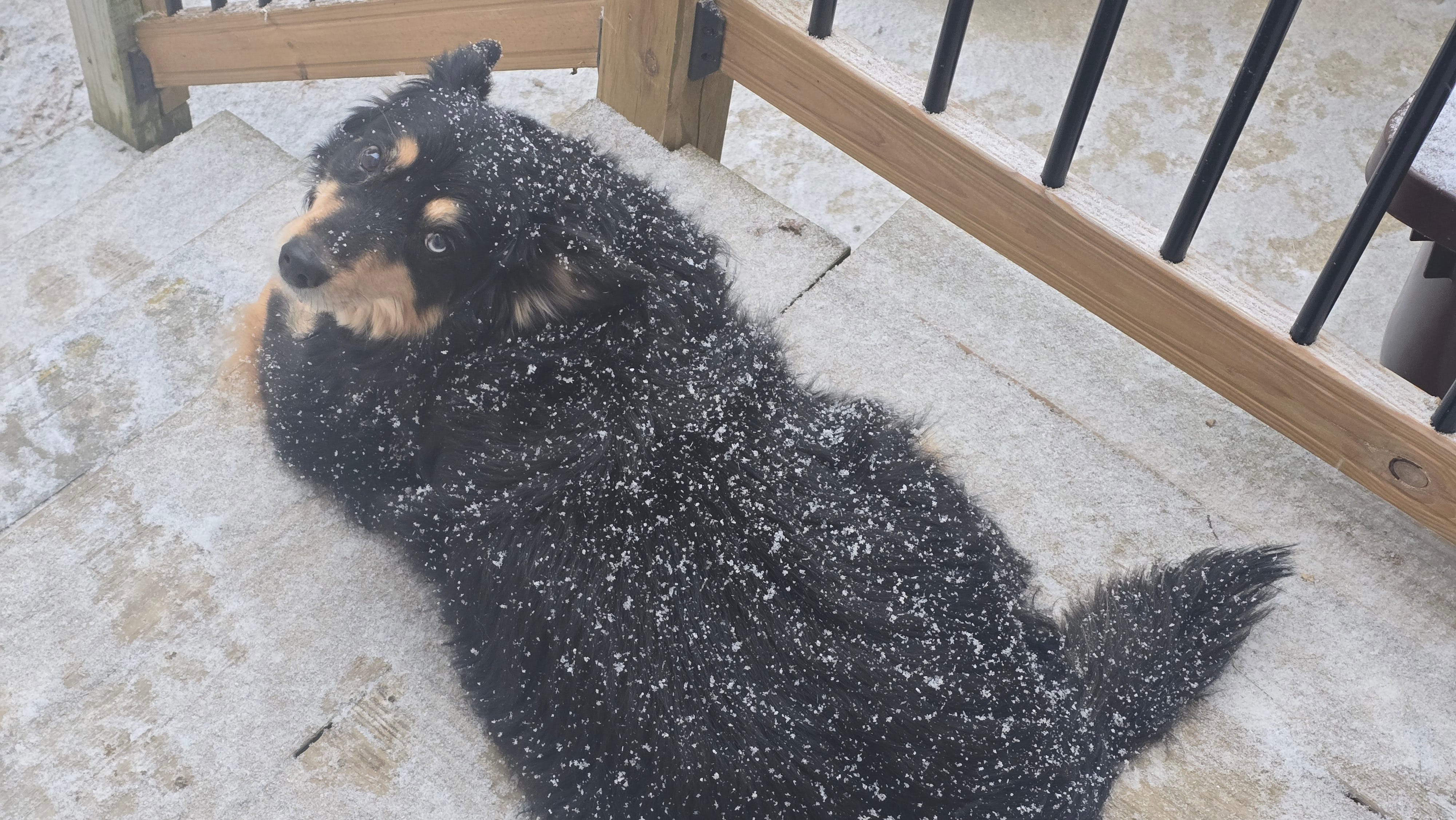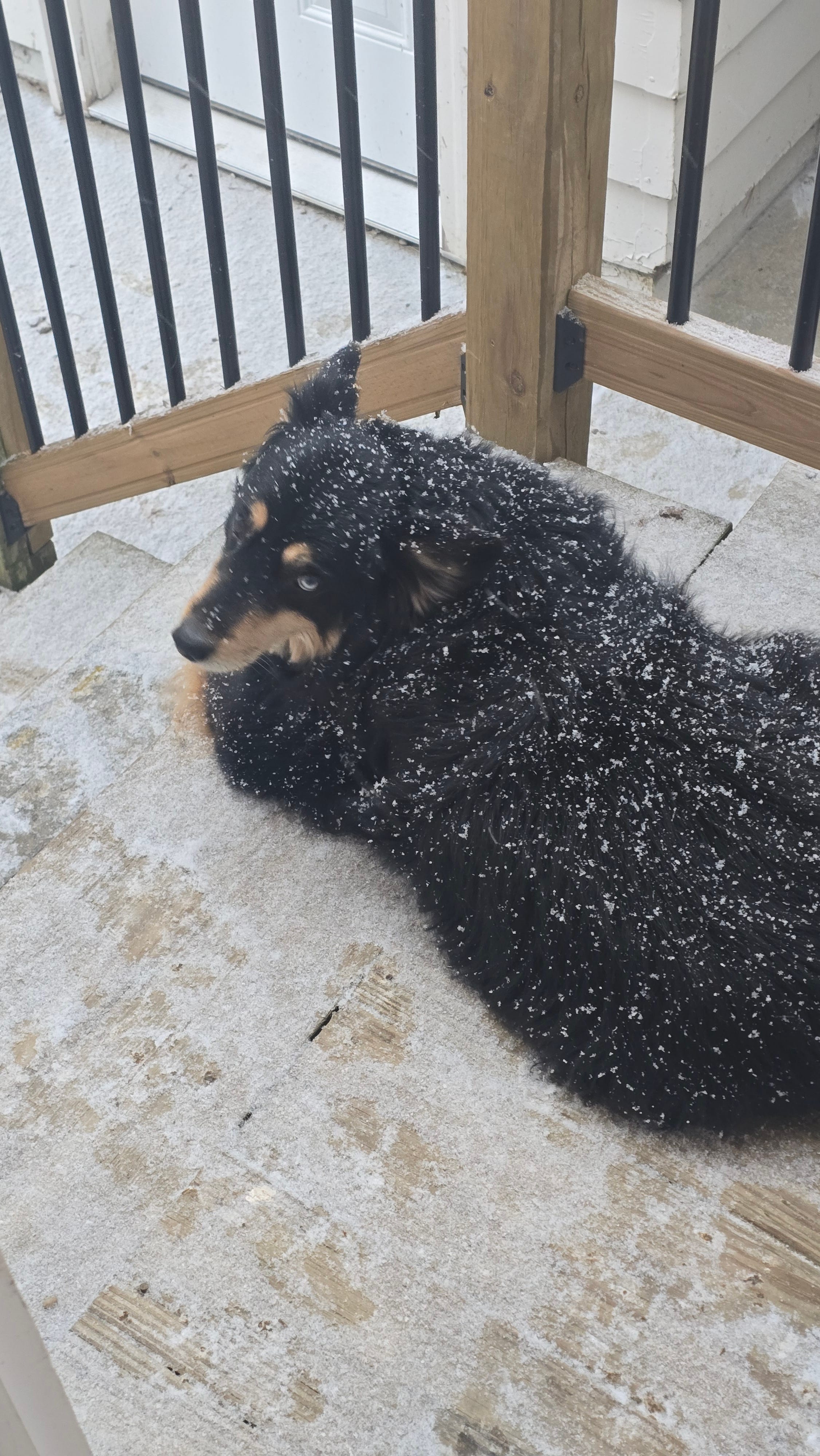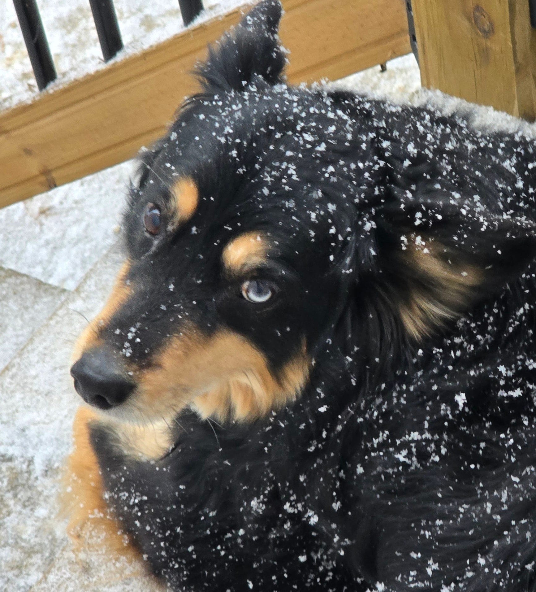 It's been 8 years. He’s a good dog ! We have to keep him trimmed up and brushed really well in warm weather. He spends most of his life outside during the day in the cold months. It's his best time I think. Note his single blue eye. That's the Pale Blue Eye of Judgement.
