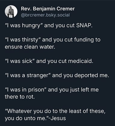 Especially for those of us who follow Jesus, many of those who have written, proposed, support, and passed this “Big Beautiful Bill” are claiming to represent us while actively going against the very heart of Jesus’ teachings and harming the very people he called us to serve.