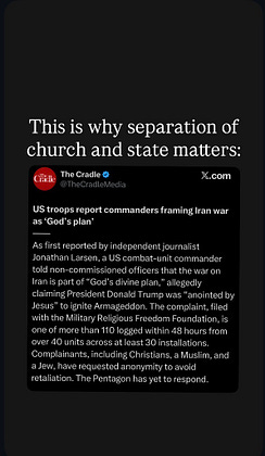 When a commander tells American troops that war with Iran is part of “God’s divine plan,” that a sitting president is “anointed by Jesus” to ignite Armageddon, and when over a hundred complaints arise across dozens of units, including from believers themselves, both our theological and constitutional alarm bells need to be going off.