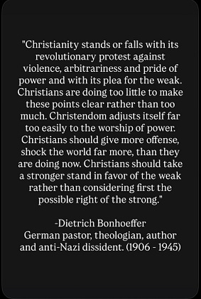 Martin Luther King Jr. would eventually be assassinated for his struggle for justice only five days before the 23rd anniversary of Bonhoeffer’s execution. They were both only 39 years old when they died. Unlike many self proclaimed prophets today, they embodied the prophets of the Bible. Instead of being a mouthpiece for kings and their empires, they spoke the truth of God to the powers of this world on behalf of the poor and powerless.