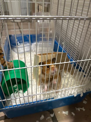 My coworker, Sunny the hamster. She’s pretty incompetent, but makes up for it with her warm personality.