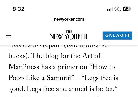 In this 6k word New Yorker article—“The Camps Promising to Turn You—or Your Son—Into an Alpha Male” AoM is given one line…referencing a 2014 article on how to poop like a samurai. Definitely archetypal of what we do.