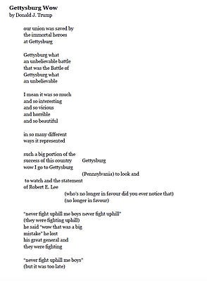 Here is the transcript of Trump’s speech yesterday, about Gettysburg, transcribed word for word, but formatted as though it was intended to be a poem called “Gettysburg Wow.”