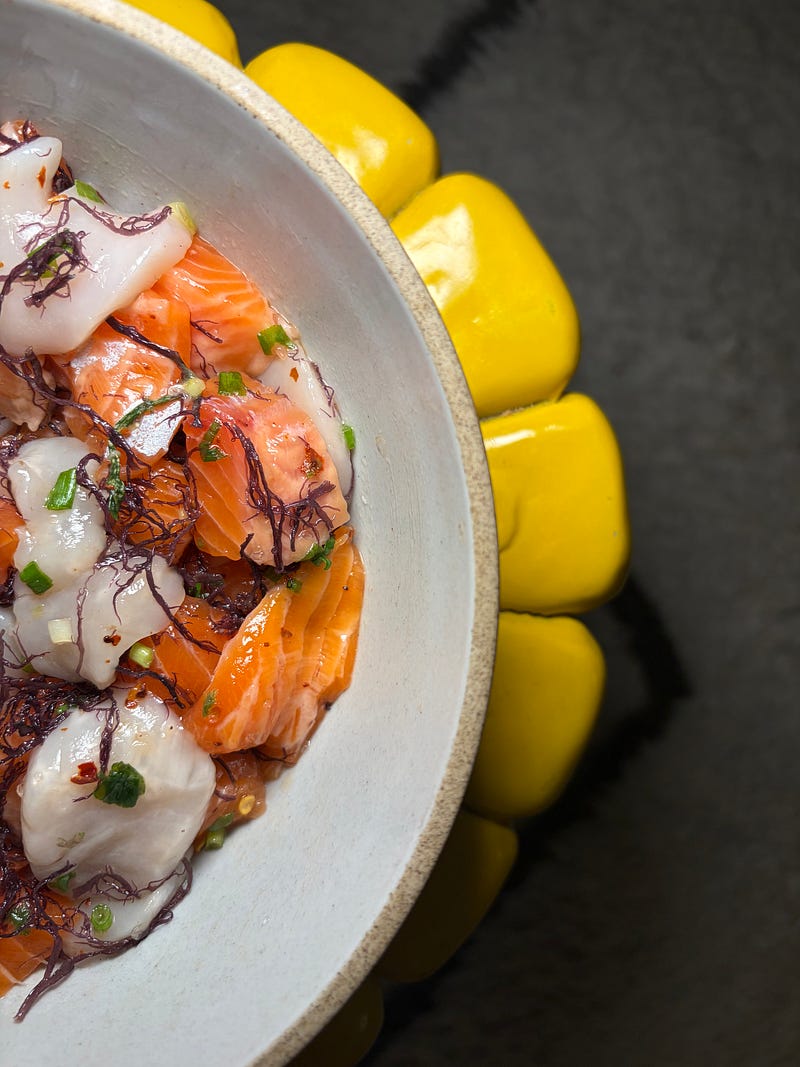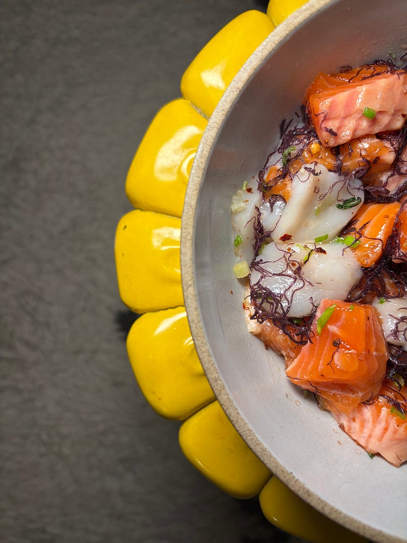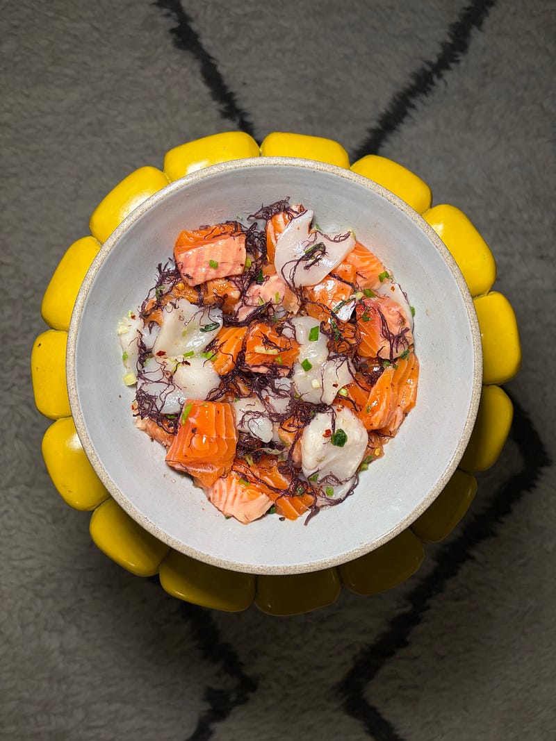 steelhead trout and scallop poke using fresh seafood from my nyc farmers market haul 🐟
