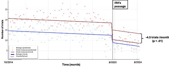 -A 45.3% drop in industry-sponsored post-approval trials for small molecules after the IRA, compared to 32.5% for biologics.