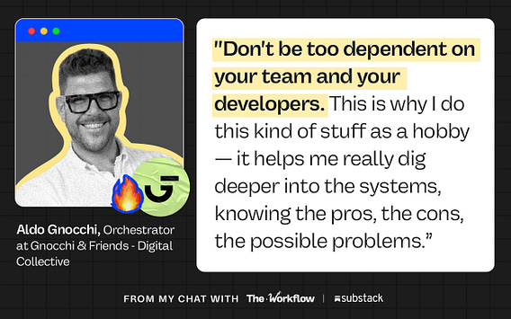 Aldo Gnocchi does the opposite — he builds workflows as a hobby so he actually understands what breaks, what works, and where the real limitations are.