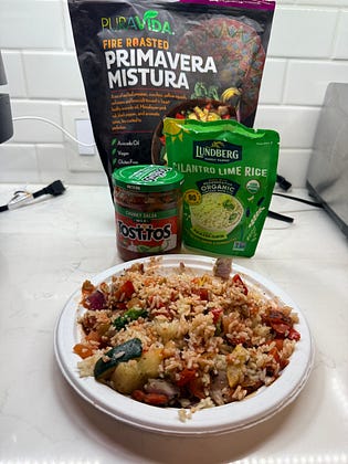 If I want more veggies and texture, I like this mixed frozen veggie bag from Costco (they can also be microwaved!). And if I want more protein, I’ll add in some beans and/or fully cooked fajita meat.