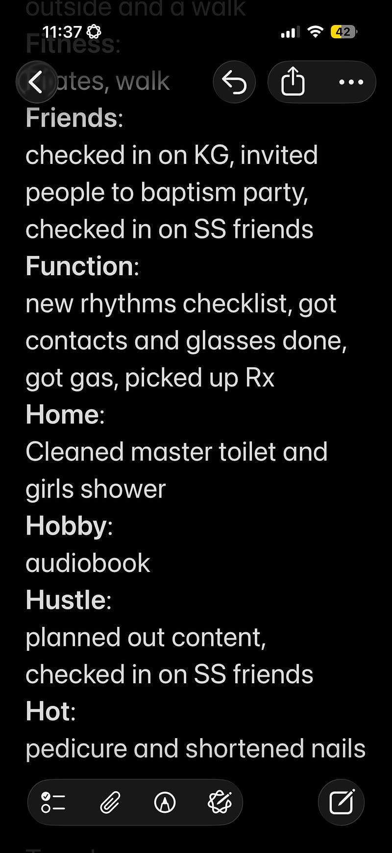 But today I opened up my Notes app and wrote out the different areas in my life that I want to make progress in (faith, fitness, home management, writing, etc) through daily sustainable rhythms.