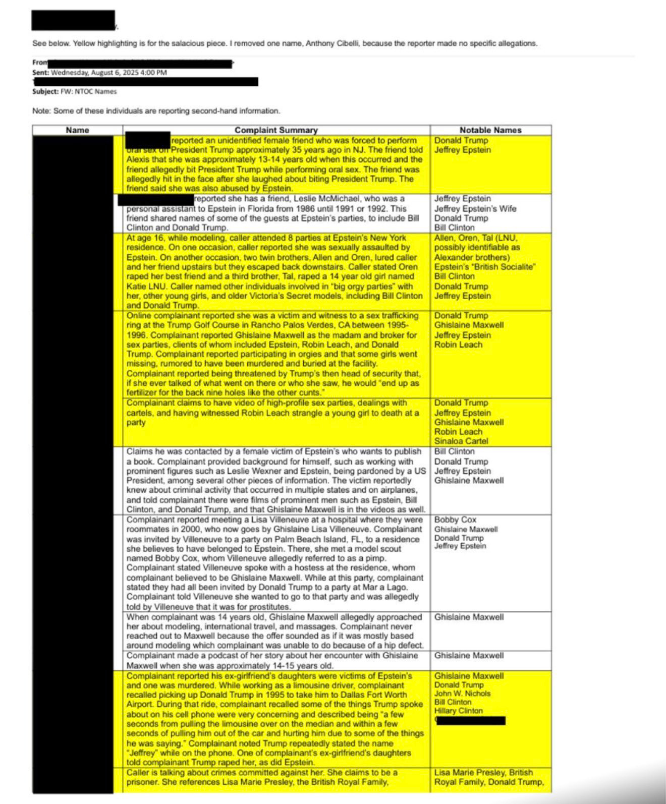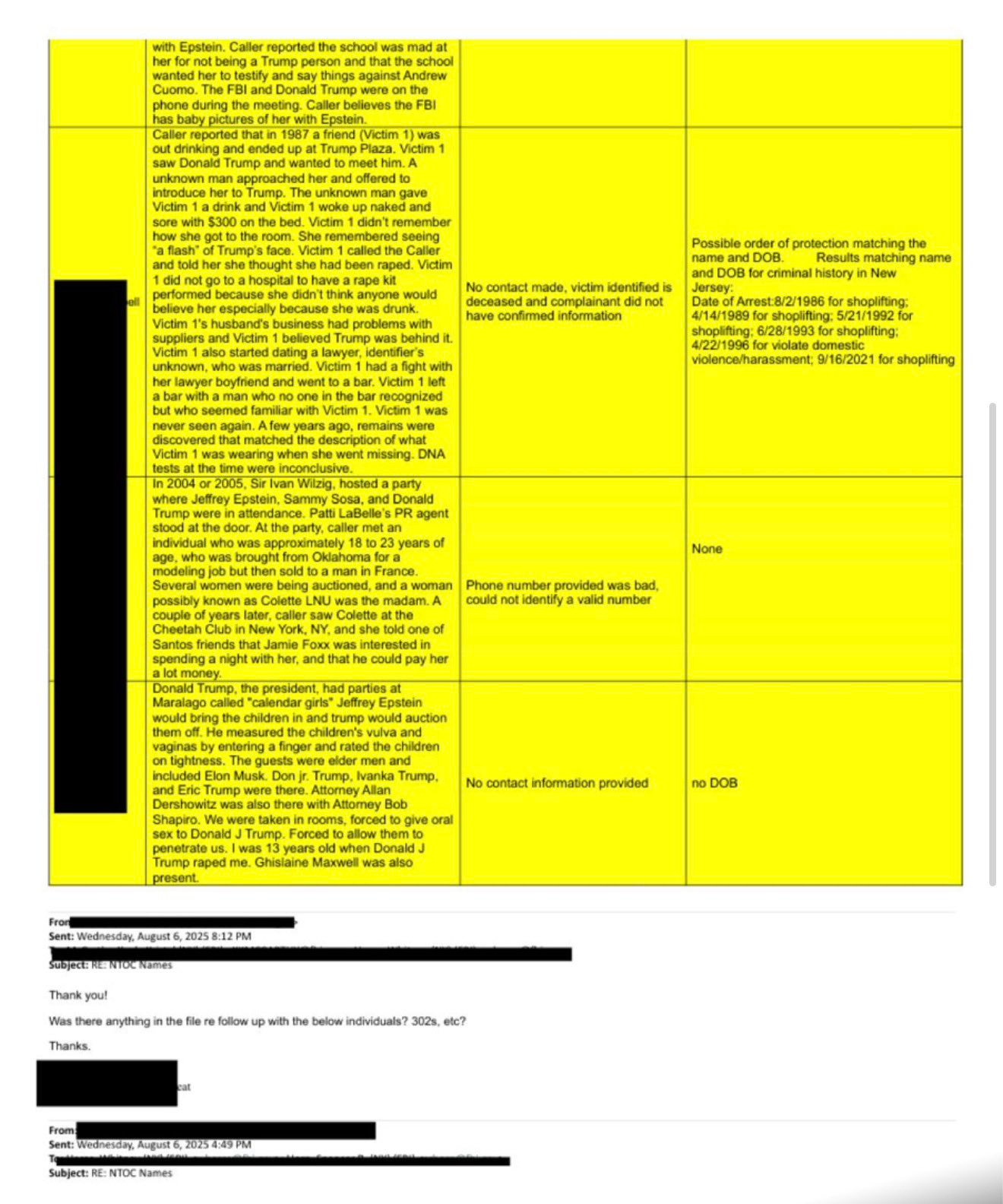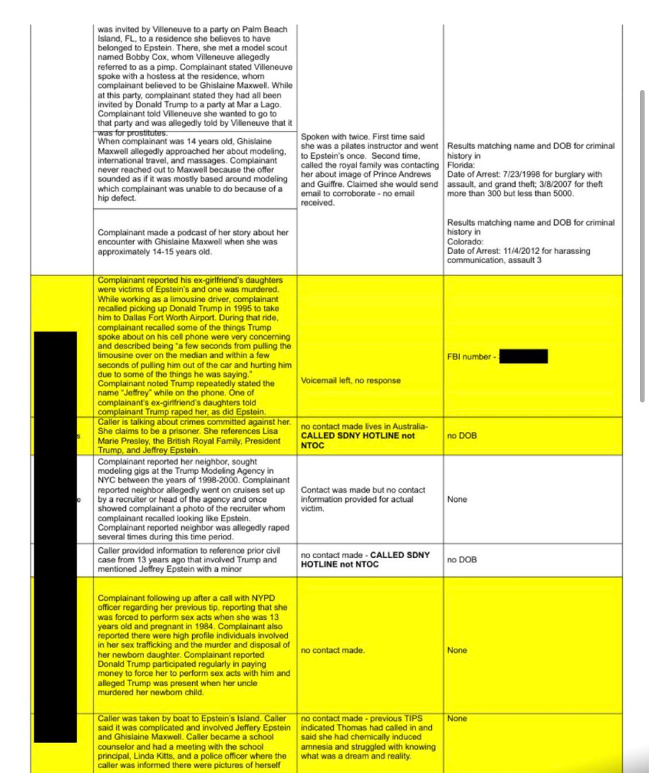I am so sick to my stomach. If this is the first time you’re seeing these, I’m so sorry. But these are complaints FBI received about Donald Trump as related to Epstein. They are newly released and have since been deleted when the press found them.