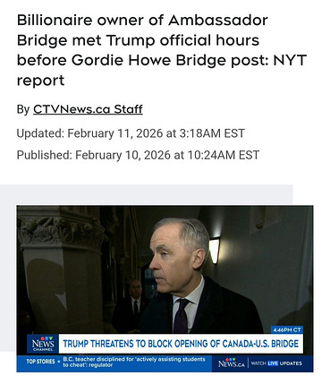 Trump's latest grift involves the new Gordie Howe bridge. Right now, the Ambassador Bridge, which connects Detroit, Michigan, and Windsor, Ontario is owned by the billionaire Moroun family. They have controlled this critical trade route since 1979. The Morouns have spent millions lobbying against the new, nearby Gordie Howe International Bridge to protect their $60+ million annual toll revenue. It's an easy bet that they offered Trump a bribe donation, through one of his crypto scam coins or otherwise, to disrupt the opening of the Gordie Howe bridge.