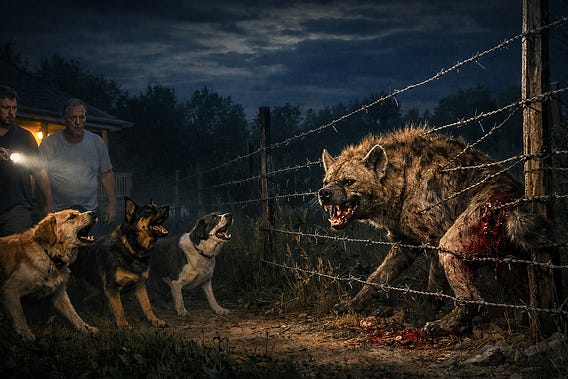 The hyena struggled. Growled. Its pain filled the night like a living thing. The dogs did not move. They stayed, vigilant, as if guarding not just the house, but the moment itself.