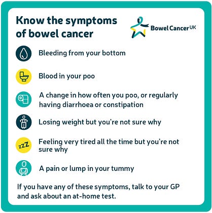 Know the symptoms of bowel cancer. Don’t doubt yourself. Don’t let poo be a taboo. Check your parents, too. Consult your GP/PCP.