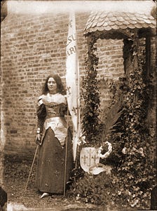 “Joan of Arc Accomplishing Her Mission” is perhaps her best-known pious recreation, thanks to the photos of the heroine in costume taken by Thérèse’s sister, Céline.