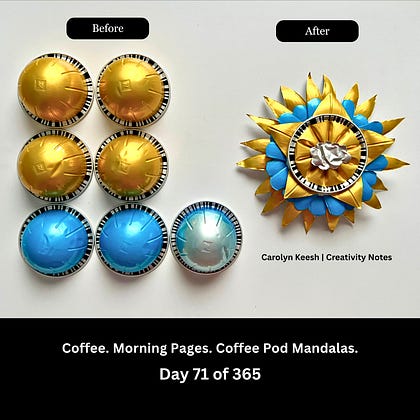 Today’s coffee pod mandala vibe: Get outside, and look up. Blue sky, sun and a fluffy white cloud. Happy Sunday, everyone!
