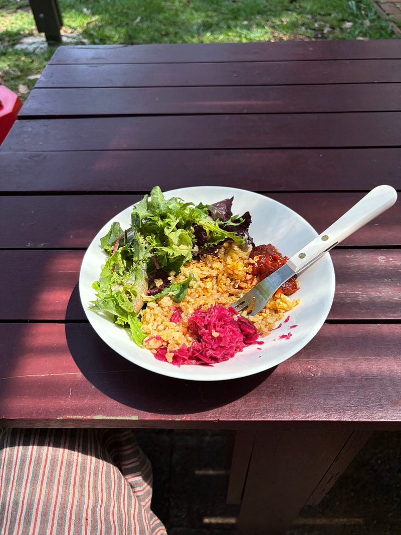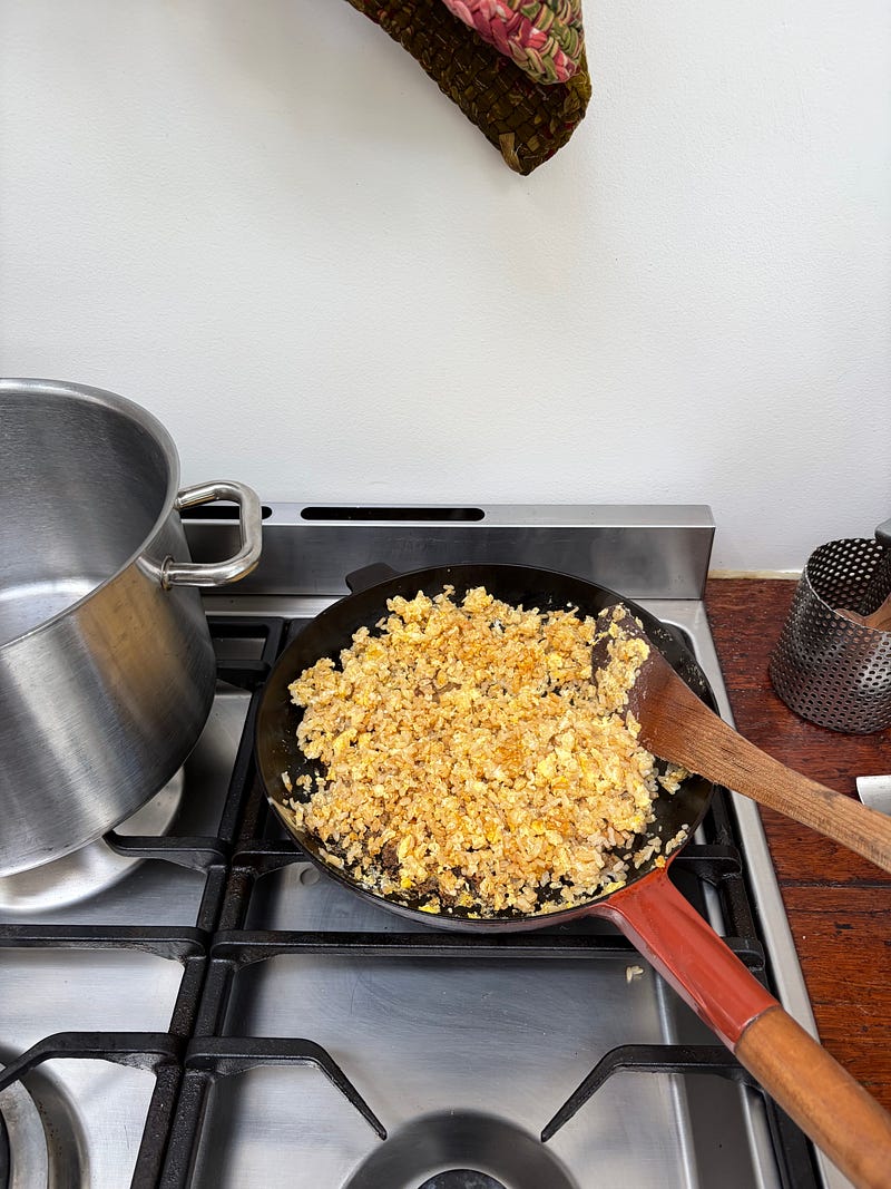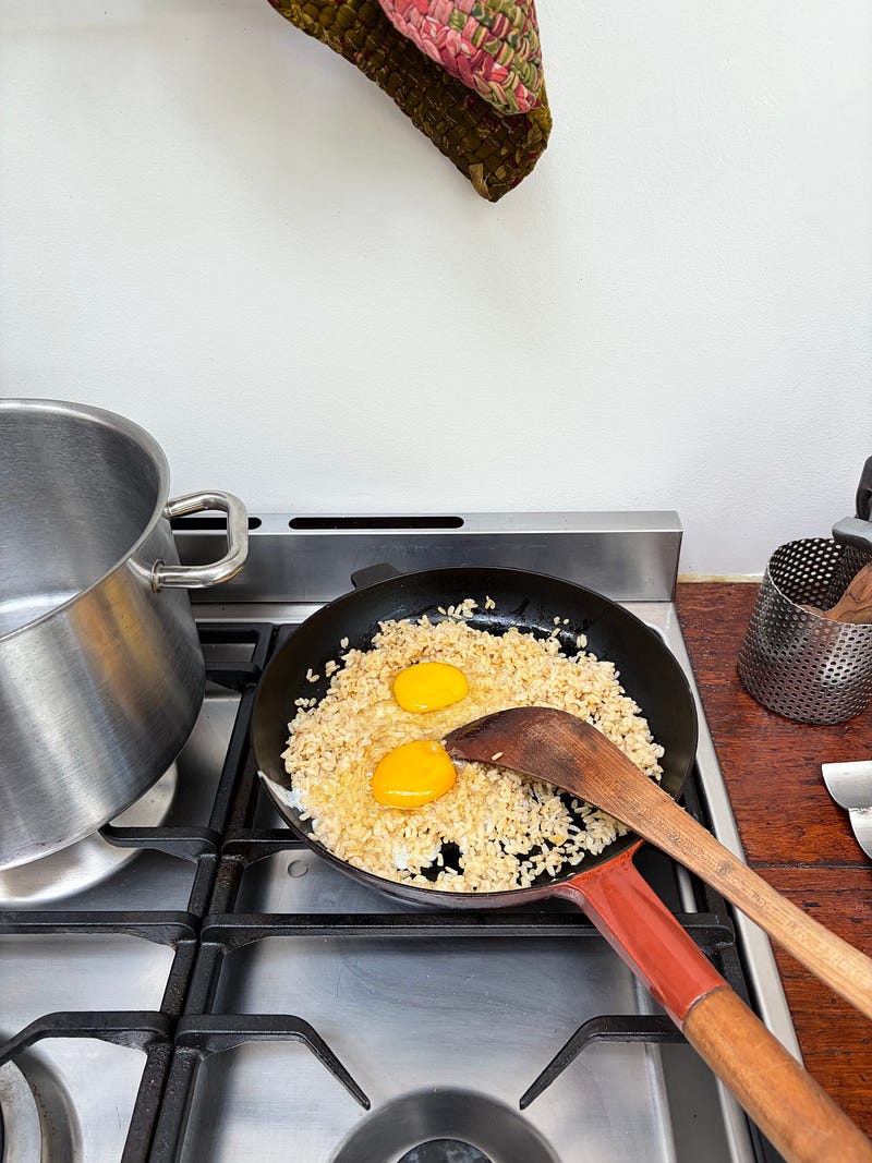 A great way to use up leftover cooked rice is to fry it with a few eggs and a splash of soy sauce. You can then add vegetables, sauerkraut, avocado, and chilli jam to make a perfect meal. For this quick lunch, I used leftover brown rice cooked in chicken stock. You can find my chilli jam recipe here..