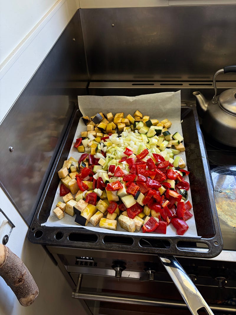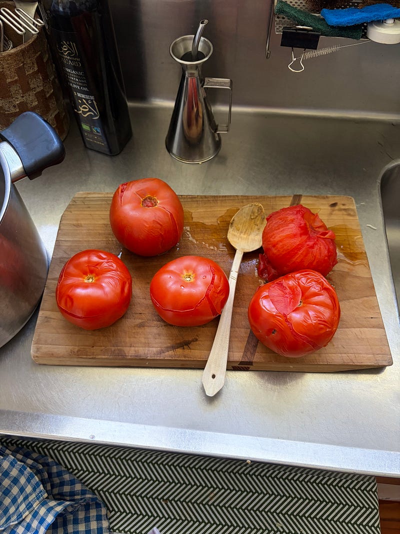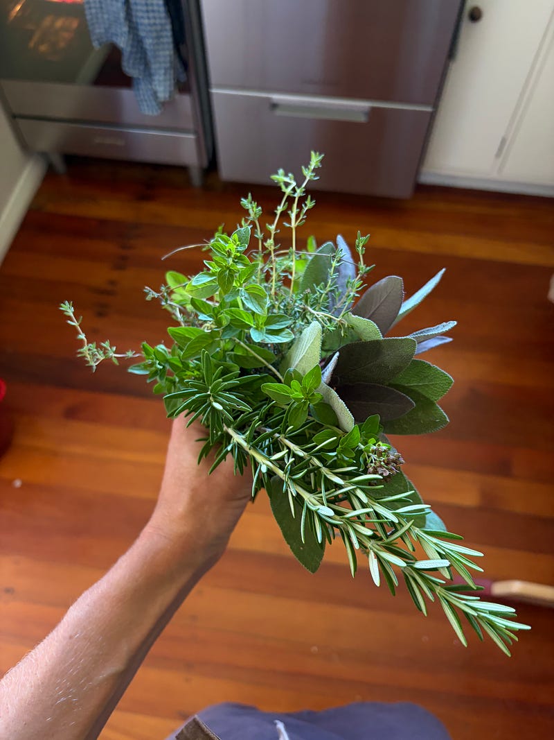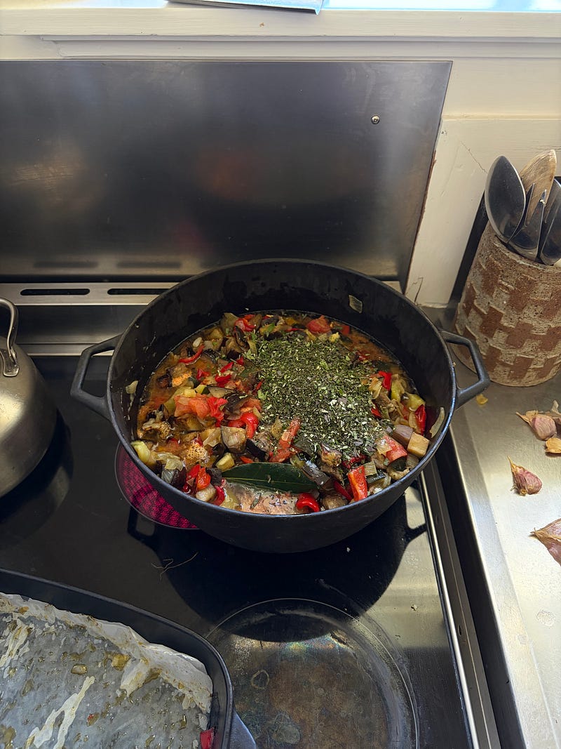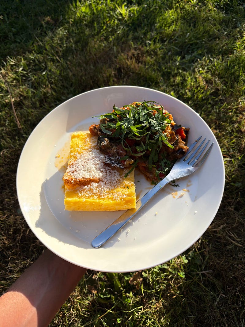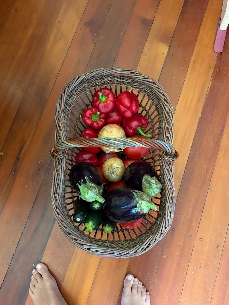 A basket full of summer vegetables for a giant pot of ratatouille to feed my family members, some of whom are vegetarian. Such a tasty vegetarian meal that can easily be made vegan, depending on how you like to cook polenta. I will share the recipe soon π