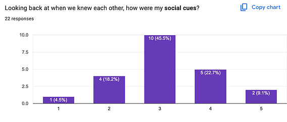 It’s definitely real, but it got better over time because I taught myself social cues very deliberately. I have a running anonymous survey with real-life connections to see if I actually was that bad, but turnout hasn’t been great. 22 responses so far: