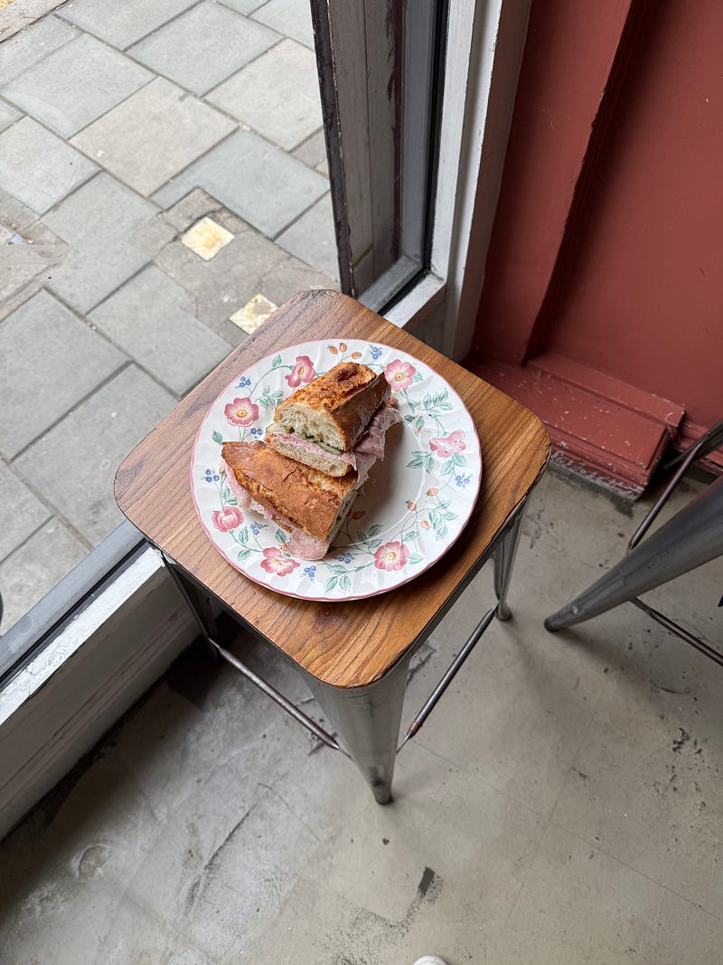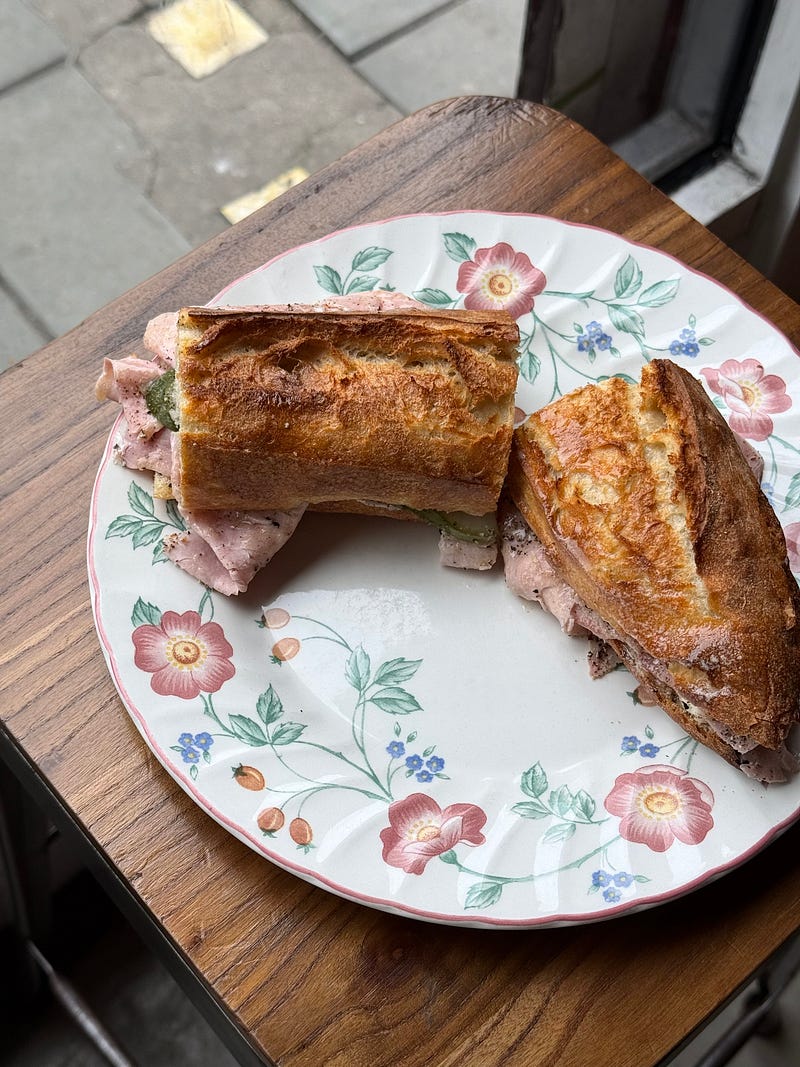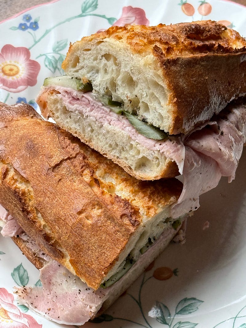 never too many angles on this jambon beurre! 100g+ butter, artisan ham, sweet house pickles, loads of freshly cracked black pepper—all in a baguette from a local bakery