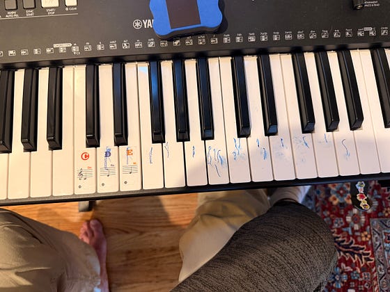 Six year old wants me to teach him piano, but won’t accept any instruction. “No no no I’m going to do it my way” as he marks up the keys.