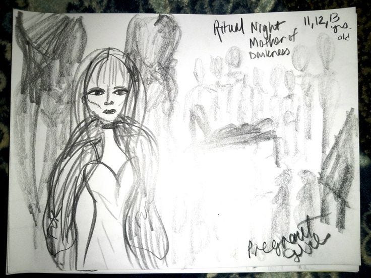 Ages 11-14: Subjected to satanic ritual abuse (SRA) involving Reptilian shapeshifters, forced pregnancies, and fetus consumption rituals.