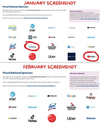 Did National PTA quietly break up with Meta and YouTube? A few days ago, I noticed that Meta and YouTube (along with a few other companies) had been mysteriously scrubbed from the National PTA’s sponsor list. What is the meaning of this? And does anyone think it’s a mere coincidence that this happened right as the landmark trial against Meta & YouTube for addicting kids began?