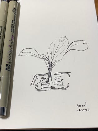 Drawing with tired hands is challenging. Got a lot of garden work done today, though.