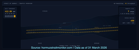 Hormuz throughput tonight: 7 ships transiting. 5.1% of normal. 400 vessels waiting outside the strait.