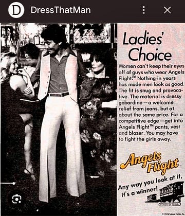 After 35 years of marriage, we have the silliest conversations. We were playing cards tonight and listening to 60s & 70s music on Pandora. The topic of dancing in Angels Flight pants came up, and I told my husband I was disappointed that I never got to see him in those. He had a nice butt when we met, but at 72 it’s not quite as nice. We…